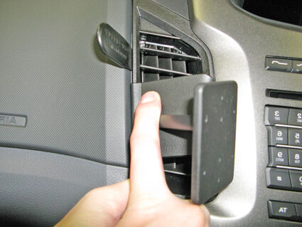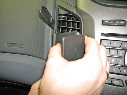 1. Use the enclosed alcohol pad to clean the area where the ClicOn is to be installed. Peel off the adhesive tape cover on the ClicOn. Press the thin end of the enclosed gap opener into the gap between the frame surrounding the air vent and the control panel, to widen the gap. Press the gap opener further into the gap and carefully prize the gap wider. In the same time: Press the angled edge on the right part of the ClicOn into the gap above the gap opener. Pull out the gap opener.