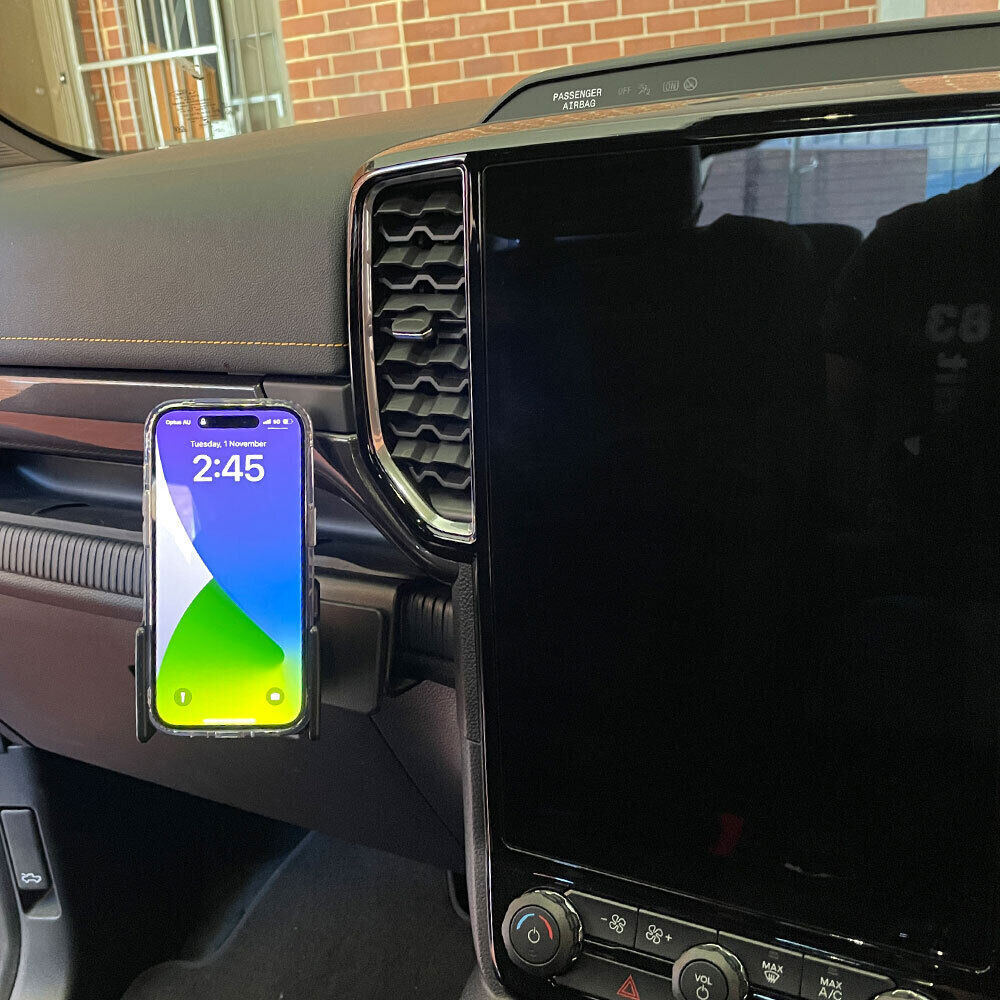 A vehicle-specific mount kit for the Ford Ranger with Non Charging Adjustable Holder. Installs easily with no drilling required. The Mount is custom made for your vehicle for a secure, stable fit. No Dropping Off. Not for Ranger Platinum or Everest