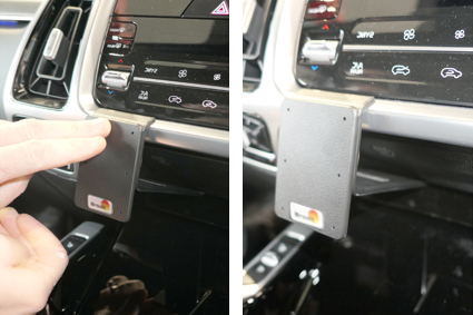 Attention! Please read all of the instructions and look at the pictures before attaching the ClicOn mount. Use the enclosed alcohol pad to clean the area where the ClicOn is to be installed. Peel off the adhesive tape covers on the ClicOn. Press the lower edge of the ClicOn into the gap between the glove compartment and the dashboard. Hook the upper edge of the ClicOn into the gap between the control panel and the surrounding frame. 2. Press down on top of the ClicOn so the angled edge hooks properly in place. 3. This ClicOn can also be installed onto the right air vent. 4. The ClicOn is in place.